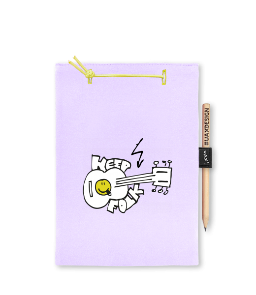 Blok A4 s vyměnitelnými papíry. Na přední straně možnost výběru z více než 300 potisků. Vyrobeno ze 100% bavlny. Výběr z 28 barev. Tiskneme ručním sítotiskem. V horní části blok A4 stažen žlutou gumičkou. 60 listů s perforací pro snadnější odtržení. Žlutá guma ve spodní části pro zajištění obalu. K bloku získáte i tužku #UAXDESIGN