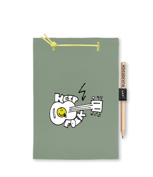 Blok A4 s vyměnitelnými papíry. Na přední straně možnost výběru z více než 300 potisků. Vyrobeno ze 100% bavlny. Výběr z 28 barev. Tiskneme ručním sítotiskem. V horní části blok A4 stažen žlutou gumičkou. 60 listů s perforací pro snadnější odtržení. Žlutá guma ve spodní části pro zajištění obalu. K bloku získáte i tužku #UAXDESIGN