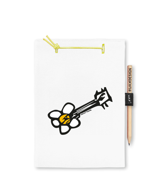 Blok A4 s vyměnitelnými papíry. Na přední straně možnost výběru z více než 300 potisků. Vyrobeno ze 100% bavlny. Výběr z 28 barev. Tiskneme ručním sítotiskem. V horní části blok A4 stažen žlutou gumičkou. 60 listů s perforací pro snadnější odtržení. Žlutá guma ve spodní části pro zajištění obalu. K bloku získáte i tužku #UAXDESIGN