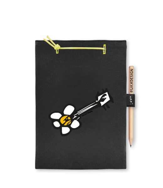 Blok A4 s vyměnitelnými papíry. Na přední straně možnost výběru z více než 300 potisků. Vyrobeno ze 100% bavlny. Výběr z 28 barev. Tiskneme ručním sítotiskem. V horní části blok A4 stažen žlutou gumičkou. 60 listů s perforací pro snadnější odtržení. Žlutá guma ve spodní části pro zajištění obalu. K bloku získáte i tužku #UAXDESIGN