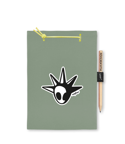 Blok A4 s vyměnitelnými papíry. Na přední straně možnost výběru z více než 300 potisků. Vyrobeno ze 100% bavlny. Výběr z 28 barev. Tiskneme ručním sítotiskem. V horní části blok A4 stažen žlutou gumičkou. 60 listů s perforací pro snadnější odtržení. Žlutá guma ve spodní části pro zajištění obalu. K bloku získáte i tužku #UAXDESIGN