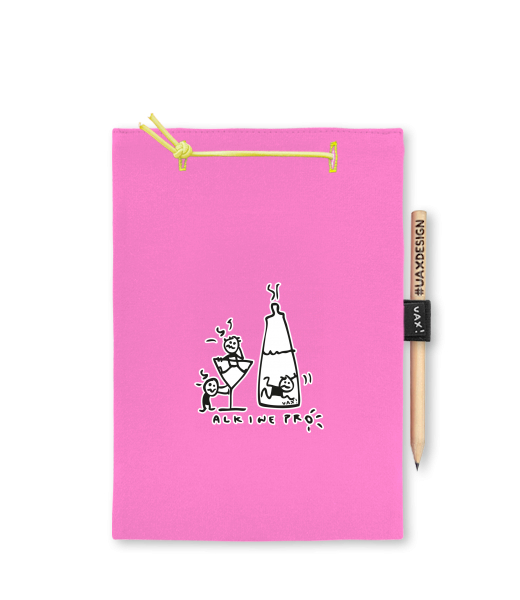 Blok A4 s vyměnitelnými papíry. Na přední straně možnost výběru z více než 300 potisků. Vyrobeno ze 100% bavlny. Výběr z 28 barev. Tiskneme ručním sítotiskem. V horní části blok A4 stažen žlutou gumičkou. 60 listů s perforací pro snadnější odtržení. Žlutá guma ve spodní části pro zajištění obalu. K bloku získáte i tužku #UAXDESIGN