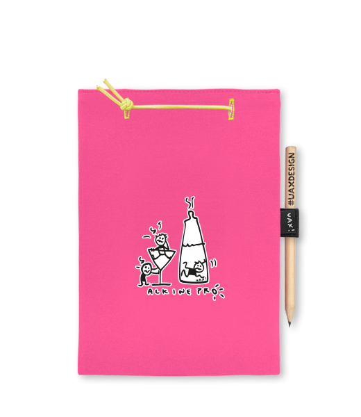 Blok A4 s vyměnitelnými papíry. Na přední straně možnost výběru z více než 300 potisků. Vyrobeno ze 100% bavlny. Výběr z 28 barev. Tiskneme ručním sítotiskem. V horní části blok A4 stažen žlutou gumičkou. 60 listů s perforací pro snadnější odtržení. Žlutá guma ve spodní části pro zajištění obalu. K bloku získáte i tužku #UAXDESIGN