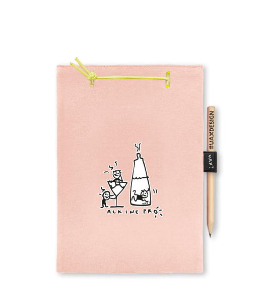 Blok A4 s vyměnitelnými papíry. Na přední straně možnost výběru z více než 300 potisků. Vyrobeno ze 100% bavlny. Výběr z 28 barev. Tiskneme ručním sítotiskem. V horní části blok A4 stažen žlutou gumičkou. 60 listů s perforací pro snadnější odtržení. Žlutá guma ve spodní části pro zajištění obalu. K bloku získáte i tužku #UAXDESIGN