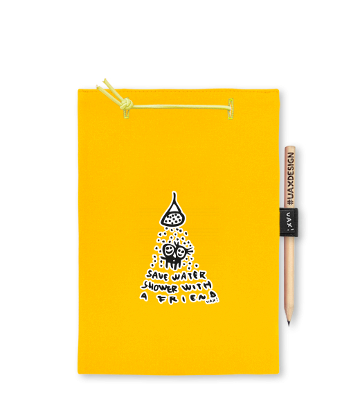 Blok A4 s vyměnitelnými papíry. Na přední straně možnost výběru z více než 300 potisků. Vyrobeno ze 100% bavlny. Výběr z 28 barev. Tiskneme ručním sítotiskem. V horní části blok A4 stažen žlutou gumičkou. 60 listů s perforací pro snadnější odtržení. Žlutá guma ve spodní části pro zajištění obalu. K bloku získáte i tužku #UAXDESIGN