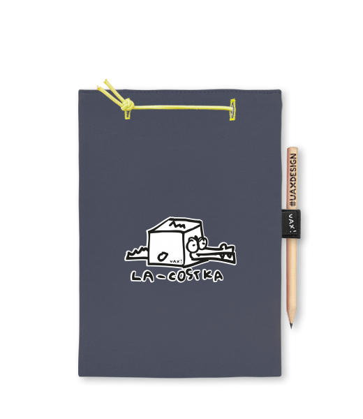 Blok A4 s vyměnitelnými papíry. Na přední straně možnost výběru z více než 300 potisků. Vyrobeno ze 100% bavlny. Výběr z 28 barev. Tiskneme ručním sítotiskem. V horní části blok A4 stažen žlutou gumičkou. 60 listů s perforací pro snadnější odtržení. Žlutá guma ve spodní části pro zajištění obalu. K bloku získáte i tužku #UAXDESIGN