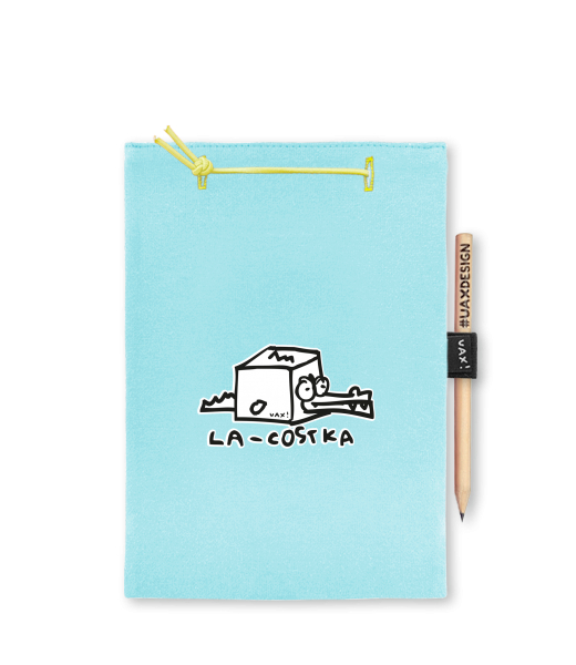 Blok A4 s vyměnitelnými papíry. Na přední straně možnost výběru z více než 300 potisků. Vyrobeno ze 100% bavlny. Výběr z 28 barev. Tiskneme ručním sítotiskem. V horní části blok A4 stažen žlutou gumičkou. 60 listů s perforací pro snadnější odtržení. Žlutá guma ve spodní části pro zajištění obalu. K bloku získáte i tužku #UAXDESIGN