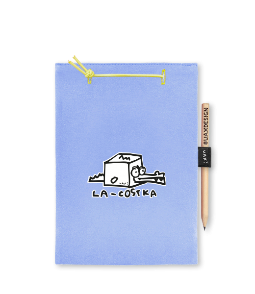 Blok A4 s vyměnitelnými papíry. Na přední straně možnost výběru z více než 300 potisků. Vyrobeno ze 100% bavlny. Výběr z 28 barev. Tiskneme ručním sítotiskem. V horní části blok A4 stažen žlutou gumičkou. 60 listů s perforací pro snadnější odtržení. Žlutá guma ve spodní části pro zajištění obalu. K bloku získáte i tužku #UAXDESIGN