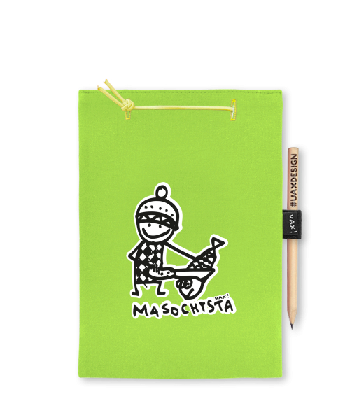 Blok A4 s vyměnitelnými papíry. Na přední straně možnost výběru z více než 300 potisků. Vyrobeno ze 100% bavlny. Výběr z 28 barev. Tiskneme ručním sítotiskem. V horní části blok A4 stažen žlutou gumičkou. 60 listů s perforací pro snadnější odtržení. Žlutá guma ve spodní části pro zajištění obalu. K bloku získáte i tužku #UAXDESIGN