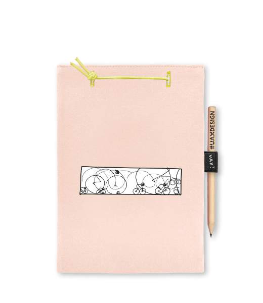 Blok A4 s vyměnitelnými papíry. Na přední straně možnost výběru z více než 300 potisků. Vyrobeno ze 100% bavlny. Výběr z 28 barev. Tiskneme ručním sítotiskem. V horní části blok A4 stažen žlutou gumičkou. 60 listů s perforací pro snadnější odtržení. Žlutá guma ve spodní části pro zajištění obalu. K bloku získáte i tužku #UAXDESIGN