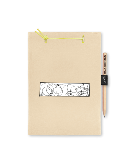 Blok A4 s vyměnitelnými papíry. Na přední straně možnost výběru z více než 300 potisků. Vyrobeno ze 100% bavlny. Výběr z 28 barev. Tiskneme ručním sítotiskem. V horní části blok A4 stažen žlutou gumičkou. 60 listů s perforací pro snadnější odtržení. Žlutá guma ve spodní části pro zajištění obalu. K bloku získáte i tužku #UAXDESIGN