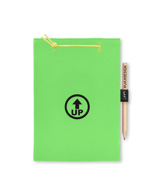 Blok A4 s vyměnitelnými papíry. Na přední straně možnost výběru z více než 300 potisků. Vyrobeno ze 100% bavlny. Výběr z 28 barev. Tiskneme ručním sítotiskem. V horní části blok A4 stažen žlutou gumičkou. 60 listů s perforací pro snadnější odtržení. Žlutá guma ve spodní části pro zajištění obalu. K bloku získáte i tužku #UAXDESIGN