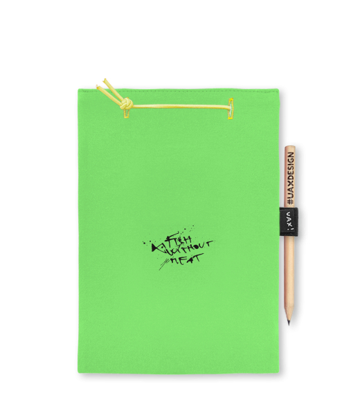 Blok A4 s vyměnitelnými papíry. Na přední straně možnost výběru z více než 300 potisků. Vyrobeno ze 100% bavlny. Výběr z 28 barev. Tiskneme ručním sítotiskem. V horní části blok A4 stažen žlutou gumičkou. 60 listů s perforací pro snadnější odtržení. Žlutá guma ve spodní části pro zajištění obalu. K bloku získáte i tužku #UAXDESIGN