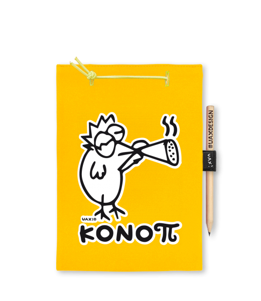 Blok A5 s vyměnitelnými papíry. Na přední straně možnost výběru z více než 300 potisků. Vyrobeno ze 100% bavlny. Výběr z 28 barev. Tiskneme ručním sítotiskem. V horní části blok A5 stažen žlutou gumičkou. 60 listů s perforací pro snadnější odtržení. Žlutá guma ve spodní části pro zajištění obalu. K bloku získáte i tužku #UAXDESIGN