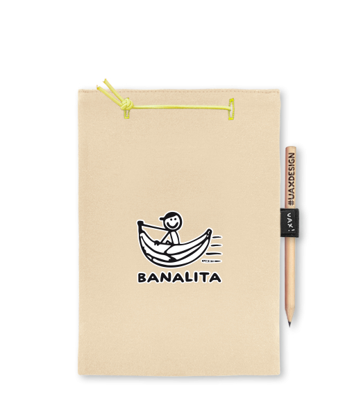 Blok A5 s vyměnitelnými papíry. Na přední straně možnost výběru z více než 300 potisků. Vyrobeno ze 100% bavlny. Výběr z 28 barev. Tiskneme ručním sítotiskem. V horní části blok A5 stažen žlutou gumičkou. 60 listů s perforací pro snadnější odtržení. Žlutá guma ve spodní části pro zajištění obalu. K bloku získáte i tužku #UAXDESIGN