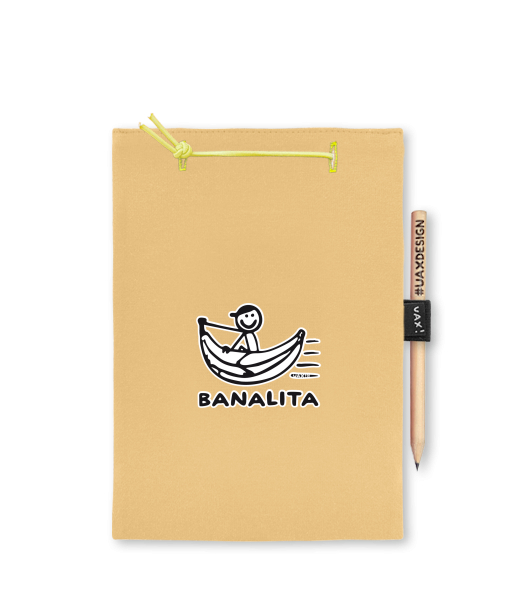 Blok A5 s vyměnitelnými papíry. Na přední straně možnost výběru z více než 300 potisků. Vyrobeno ze 100% bavlny. Výběr z 28 barev. Tiskneme ručním sítotiskem. V horní části blok A5 stažen žlutou gumičkou. 60 listů s perforací pro snadnější odtržení. Žlutá guma ve spodní části pro zajištění obalu. K bloku získáte i tužku #UAXDESIGN