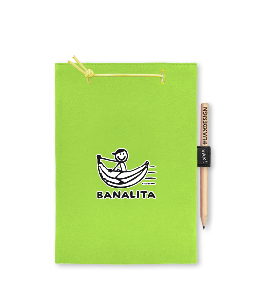 Blok A5 s vyměnitelnými papíry. Na přední straně možnost výběru z více než 300 potisků. Vyrobeno ze 100% bavlny. Výběr z 28 barev. Tiskneme ručním sítotiskem. V horní části blok A5 stažen žlutou gumičkou. 60 listů s perforací pro snadnější odtržení. Žlutá guma ve spodní části pro zajištění obalu. K bloku získáte i tužku #UAXDESIGN