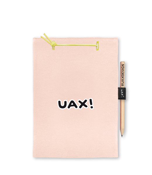 Blok A5 s vyměnitelnými papíry. Na přední straně možnost výběru z více než 300 potisků. Vyrobeno ze 100% bavlny. Výběr z 28 barev. Tiskneme ručním sítotiskem. V horní části blok A5 stažen žlutou gumičkou. 60 listů s perforací pro snadnější odtržení. Žlutá guma ve spodní části pro zajištění obalu. K bloku získáte i tužku #UAXDESIGN