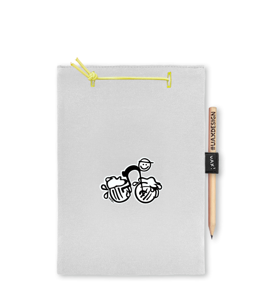 Blok A5 s vyměnitelnými papíry. Na přední straně možnost výběru z více než 300 potisků. Vyrobeno ze 100% bavlny. Výběr z 28 barev. Tiskneme ručním sítotiskem. V horní části blok A5 stažen žlutou gumičkou. 60 listů s perforací pro snadnější odtržení. Žlutá guma ve spodní části pro zajištění obalu. K bloku získáte i tužku #UAXDESIGN