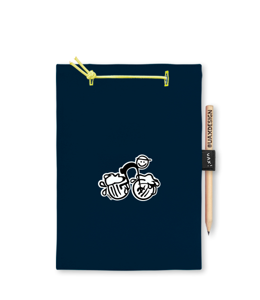Blok A5 s vyměnitelnými papíry. Na přední straně možnost výběru z více než 300 potisků. Vyrobeno ze 100% bavlny. Výběr z 28 barev. Tiskneme ručním sítotiskem. V horní části blok A5 stažen žlutou gumičkou. 60 listů s perforací pro snadnější odtržení. Žlutá guma ve spodní části pro zajištění obalu. K bloku získáte i tužku #UAXDESIGN