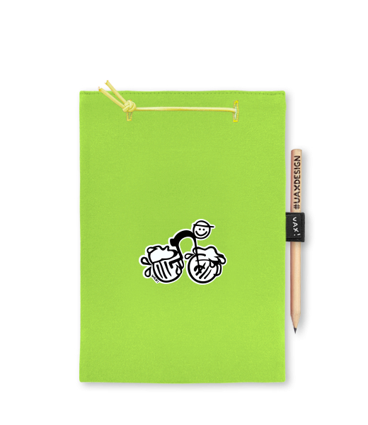 Blok A5 s vyměnitelnými papíry. Na přední straně možnost výběru z více než 300 potisků. Vyrobeno ze 100% bavlny. Výběr z 28 barev. Tiskneme ručním sítotiskem. V horní části blok A5 stažen žlutou gumičkou. 60 listů s perforací pro snadnější odtržení. Žlutá guma ve spodní části pro zajištění obalu. K bloku získáte i tužku #UAXDESIGN