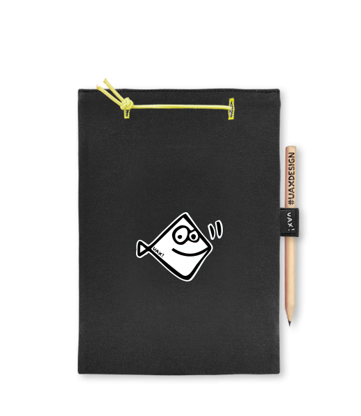 Blok A5 s vyměnitelnými papíry. Na přední straně možnost výběru z více než 300 potisků. Vyrobeno ze 100% bavlny. Výběr z 28 barev. Tiskneme ručním sítotiskem. V horní části blok A5 stažen žlutou gumičkou. 60 listů s perforací pro snadnější odtržení. Žlutá guma ve spodní části pro zajištění obalu. K bloku získáte i tužku #UAXDESIGN