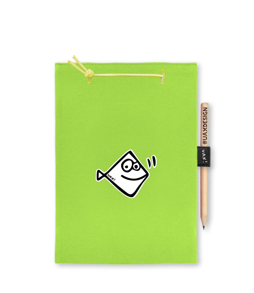 Blok A5 s vyměnitelnými papíry. Na přední straně možnost výběru z více než 300 potisků. Vyrobeno ze 100% bavlny. Výběr z 28 barev. Tiskneme ručním sítotiskem. V horní části blok A5 stažen žlutou gumičkou. 60 listů s perforací pro snadnější odtržení. Žlutá guma ve spodní části pro zajištění obalu. K bloku získáte i tužku #UAXDESIGN