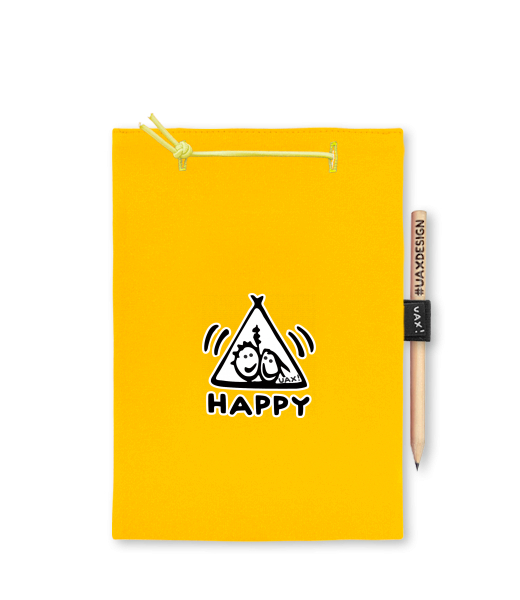 Blok A5 s vyměnitelnými papíry. Na přední straně možnost výběru z více než 300 potisků. Vyrobeno ze 100% bavlny. Výběr z 28 barev. Tiskneme ručním sítotiskem. V horní části blok A5 stažen žlutou gumičkou. 60 listů s perforací pro snadnější odtržení. Žlutá guma ve spodní části pro zajištění obalu. K bloku získáte i tužku #UAXDESIGN