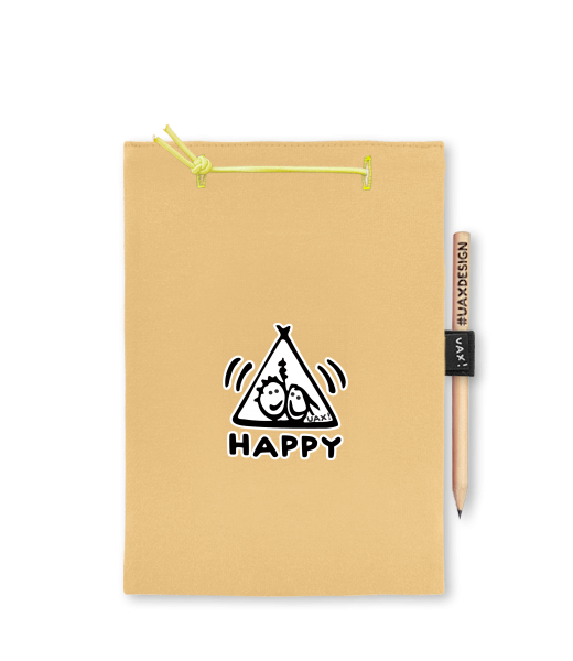 Blok A5 s vyměnitelnými papíry. Na přední straně možnost výběru z více než 300 potisků. Vyrobeno ze 100% bavlny. Výběr z 28 barev. Tiskneme ručním sítotiskem. V horní části blok A5 stažen žlutou gumičkou. 60 listů s perforací pro snadnější odtržení. Žlutá guma ve spodní části pro zajištění obalu. K bloku získáte i tužku #UAXDESIGN
