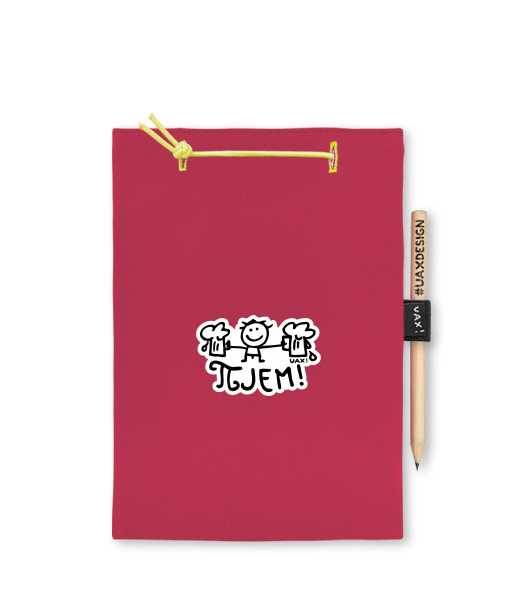 Blok A5 s vyměnitelnými papíry. Na přední straně možnost výběru z více než 300 potisků. Vyrobeno ze 100% bavlny. Výběr z 28 barev. Tiskneme ručním sítotiskem. V horní části blok A5 stažen žlutou gumičkou. 60 listů s perforací pro snadnější odtržení. Žlutá guma ve spodní části pro zajištění obalu. K bloku získáte i tužku #UAXDESIGN