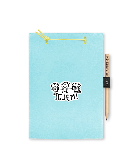 Blok A5 s vyměnitelnými papíry. Na přední straně možnost výběru z více než 300 potisků. Vyrobeno ze 100% bavlny. Výběr z 28 barev. Tiskneme ručním sítotiskem. V horní části blok A5 stažen žlutou gumičkou. 60 listů s perforací pro snadnější odtržení. Žlutá guma ve spodní části pro zajištění obalu. K bloku získáte i tužku #UAXDESIGN