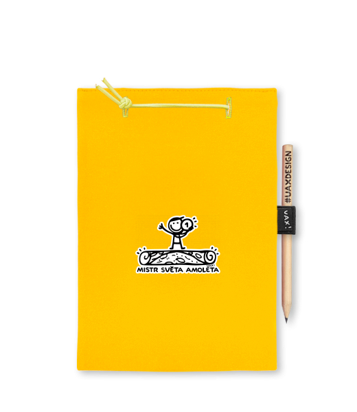 Blok A5 s vyměnitelnými papíry. Na přední straně možnost výběru z více než 300 potisků. Vyrobeno ze 100% bavlny. Výběr z 28 barev. Tiskneme ručním sítotiskem. V horní části blok A5 stažen žlutou gumičkou. 60 listů s perforací pro snadnější odtržení. Žlutá guma ve spodní části pro zajištění obalu. K bloku získáte i tužku #UAXDESIGN
