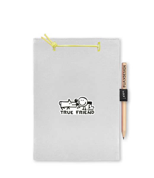 Blok A5 s vyměnitelnými papíry. Na přední straně možnost výběru z více než 300 potisků. Vyrobeno ze 100% bavlny. Výběr z 28 barev. Tiskneme ručním sítotiskem. V horní části blok A5 stažen žlutou gumičkou. 60 listů s perforací pro snadnější odtržení. Žlutá guma ve spodní části pro zajištění obalu. K bloku získáte i tužku #UAXDESIGN