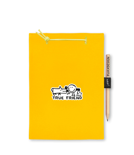 Blok A5 s vyměnitelnými papíry. Na přední straně možnost výběru z více než 300 potisků. Vyrobeno ze 100% bavlny. Výběr z 28 barev. Tiskneme ručním sítotiskem. V horní části blok A5 stažen žlutou gumičkou. 60 listů s perforací pro snadnější odtržení. Žlutá guma ve spodní části pro zajištění obalu. K bloku získáte i tužku #UAXDESIGN