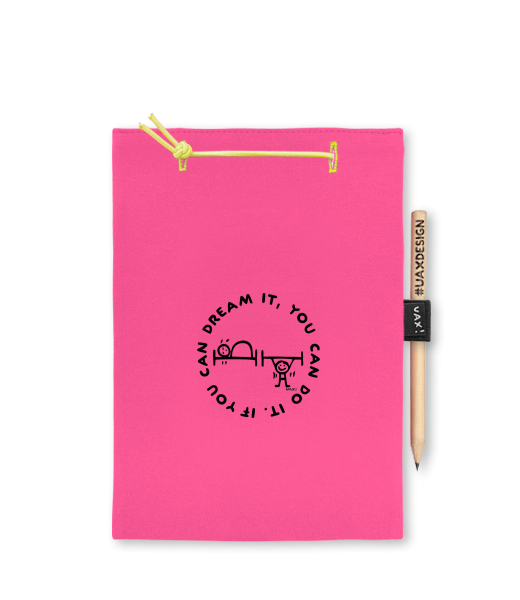 Blok A5 s vyměnitelnými papíry. Na přední straně možnost výběru z více než 300 potisků. Vyrobeno ze 100% bavlny. Výběr z 28 barev. Tiskneme ručním sítotiskem. V horní části blok A5 stažen žlutou gumičkou. 60 listů s perforací pro snadnější odtržení. Žlutá guma ve spodní části pro zajištění obalu. K bloku získáte i tužku #UAXDESIGN