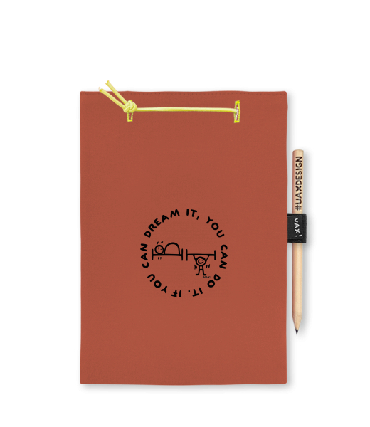 Blok A5 s vyměnitelnými papíry. Na přední straně možnost výběru z více než 300 potisků. Vyrobeno ze 100% bavlny. Výběr z 28 barev. Tiskneme ručním sítotiskem. V horní části blok A5 stažen žlutou gumičkou. 60 listů s perforací pro snadnější odtržení. Žlutá guma ve spodní části pro zajištění obalu. K bloku získáte i tužku #UAXDESIGN