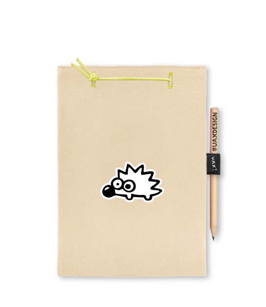Blok A5 s vyměnitelnými papíry. Na přední straně možnost výběru z více než 300 potisků. Vyrobeno ze 100% bavlny. Výběr z 28 barev. Tiskneme ručním sítotiskem. V horní části blok A5 stažen žlutou gumičkou. 60 listů s perforací pro snadnější odtržení. Žlutá guma ve spodní části pro zajištění obalu. K bloku získáte i tužku #UAXDESIGN