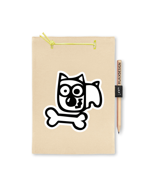 Blok A5 s vyměnitelnými papíry. Na přední straně možnost výběru z více než 300 potisků. Vyrobeno ze 100% bavlny. Výběr z 28 barev. Tiskneme ručním sítotiskem. V horní části blok A5 stažen žlutou gumičkou. 60 listů s perforací pro snadnější odtržení. Žlutá guma ve spodní části pro zajištění obalu. K bloku získáte i tužku #UAXDESIGN