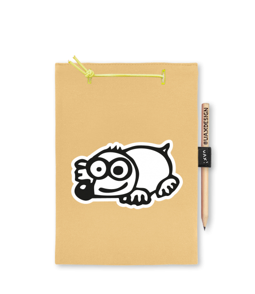 Blok A5 s vyměnitelnými papíry. Na přední straně možnost výběru z více než 300 potisků. Vyrobeno ze 100% bavlny. Výběr z 28 barev. Tiskneme ručním sítotiskem. V horní části blok A5 stažen žlutou gumičkou. 60 listů s perforací pro snadnější odtržení. Žlutá guma ve spodní části pro zajištění obalu. K bloku získáte i tužku #UAXDESIGN