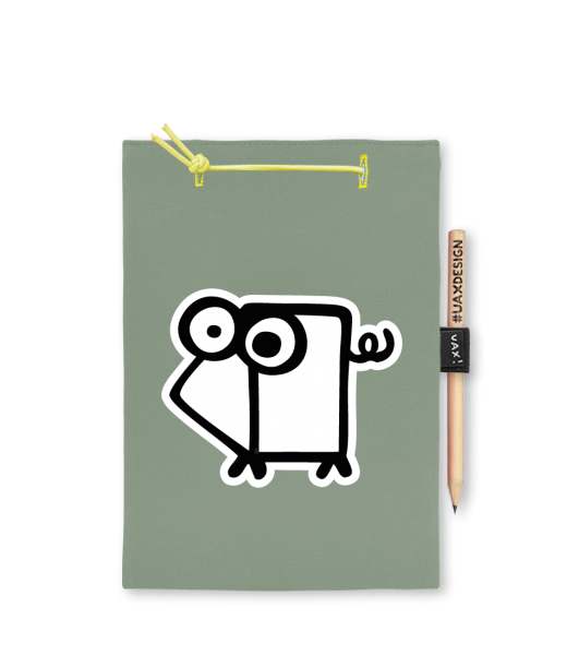 Blok A5 s vyměnitelnými papíry. Na přední straně možnost výběru z více než 300 potisků. Vyrobeno ze 100% bavlny. Výběr z 28 barev. Tiskneme ručním sítotiskem. V horní části blok A5 stažen žlutou gumičkou. 60 listů s perforací pro snadnější odtržení. Žlutá guma ve spodní části pro zajištění obalu. K bloku získáte i tužku #UAXDESIGN