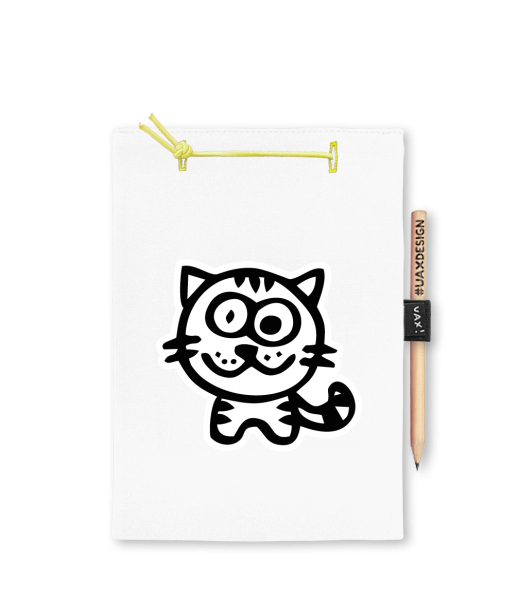 Blok A5 s vyměnitelnými papíry. Na přední straně možnost výběru z více než 300 potisků. Vyrobeno ze 100% bavlny. Výběr z 28 barev. Tiskneme ručním sítotiskem. V horní části blok A5 stažen žlutou gumičkou. 60 listů s perforací pro snadnější odtržení. Žlutá guma ve spodní části pro zajištění obalu. K bloku získáte i tužku #UAXDESIGN