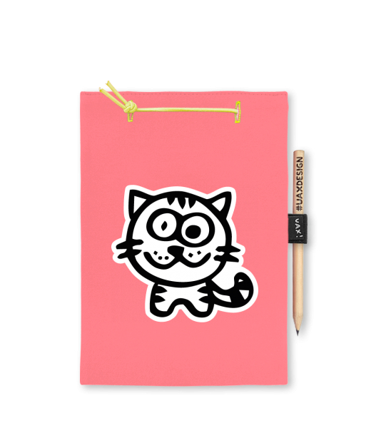 Blok A5 s vyměnitelnými papíry. Na přední straně možnost výběru z více než 300 potisků. Vyrobeno ze 100% bavlny. Výběr z 28 barev. Tiskneme ručním sítotiskem. V horní části blok A5 stažen žlutou gumičkou. 60 listů s perforací pro snadnější odtržení. Žlutá guma ve spodní části pro zajištění obalu. K bloku získáte i tužku #UAXDESIGN