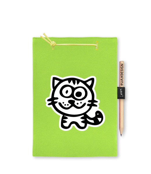 Blok A5 s vyměnitelnými papíry. Na přední straně možnost výběru z více než 300 potisků. Vyrobeno ze 100% bavlny. Výběr z 28 barev. Tiskneme ručním sítotiskem. V horní části blok A5 stažen žlutou gumičkou. 60 listů s perforací pro snadnější odtržení. Žlutá guma ve spodní části pro zajištění obalu. K bloku získáte i tužku #UAXDESIGN