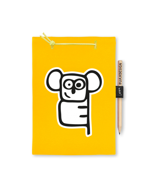 Blok A5 s vyměnitelnými papíry. Na přední straně možnost výběru z více než 300 potisků. Vyrobeno ze 100% bavlny. Výběr z 28 barev. Tiskneme ručním sítotiskem. V horní části blok A5 stažen žlutou gumičkou. 60 listů s perforací pro snadnější odtržení. Žlutá guma ve spodní části pro zajištění obalu. K bloku získáte i tužku #UAXDESIGN