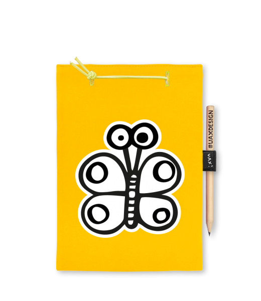 Blok A5 s vyměnitelnými papíry. Na přední straně možnost výběru z více než 300 potisků. Vyrobeno ze 100% bavlny. Výběr z 28 barev. Tiskneme ručním sítotiskem. V horní části blok A5 stažen žlutou gumičkou. 60 listů s perforací pro snadnější odtržení. Žlutá guma ve spodní části pro zajištění obalu. K bloku získáte i tužku #UAXDESIGN