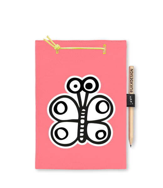 Blok A5 s vyměnitelnými papíry. Na přední straně možnost výběru z více než 300 potisků. Vyrobeno ze 100% bavlny. Výběr z 28 barev. Tiskneme ručním sítotiskem. V horní části blok A5 stažen žlutou gumičkou. 60 listů s perforací pro snadnější odtržení. Žlutá guma ve spodní části pro zajištění obalu. K bloku získáte i tužku #UAXDESIGN