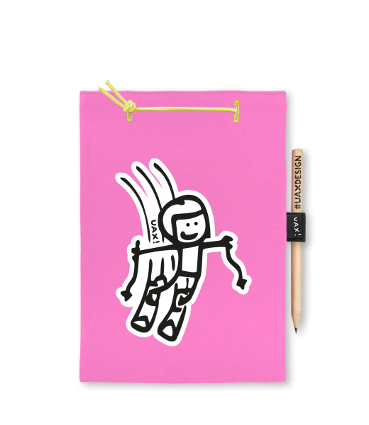 Blok A5 s vyměnitelnými papíry. Na přední straně možnost výběru z více než 300 potisků. Vyrobeno ze 100% bavlny. Výběr z 28 barev. Tiskneme ručním sítotiskem. V horní části blok A5 stažen žlutou gumičkou. 60 listů s perforací pro snadnější odtržení. Žlutá guma ve spodní části pro zajištění obalu. K bloku získáte i tužku #UAXDESIGN