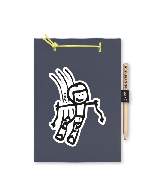 Blok A5 s vyměnitelnými papíry. Na přední straně možnost výběru z více než 300 potisků. Vyrobeno ze 100% bavlny. Výběr z 28 barev. Tiskneme ručním sítotiskem. V horní části blok A5 stažen žlutou gumičkou. 60 listů s perforací pro snadnější odtržení. Žlutá guma ve spodní části pro zajištění obalu. K bloku získáte i tužku #UAXDESIGN