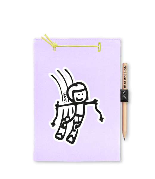 Blok A5 s vyměnitelnými papíry. Na přední straně možnost výběru z více než 300 potisků. Vyrobeno ze 100% bavlny. Výběr z 28 barev. Tiskneme ručním sítotiskem. V horní části blok A5 stažen žlutou gumičkou. 60 listů s perforací pro snadnější odtržení. Žlutá guma ve spodní části pro zajištění obalu. K bloku získáte i tužku #UAXDESIGN