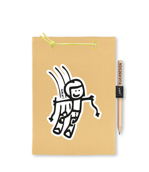 Blok A5 s vyměnitelnými papíry. Na přední straně možnost výběru z více než 300 potisků. Vyrobeno ze 100% bavlny. Výběr z 28 barev. Tiskneme ručním sítotiskem. V horní části blok A5 stažen žlutou gumičkou. 60 listů s perforací pro snadnější odtržení. Žlutá guma ve spodní části pro zajištění obalu. K bloku získáte i tužku #UAXDESIGN